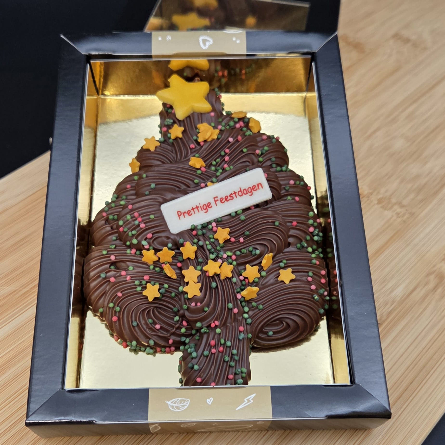 Handgespoten chocolade kerstboom uit eigen bakkerij.