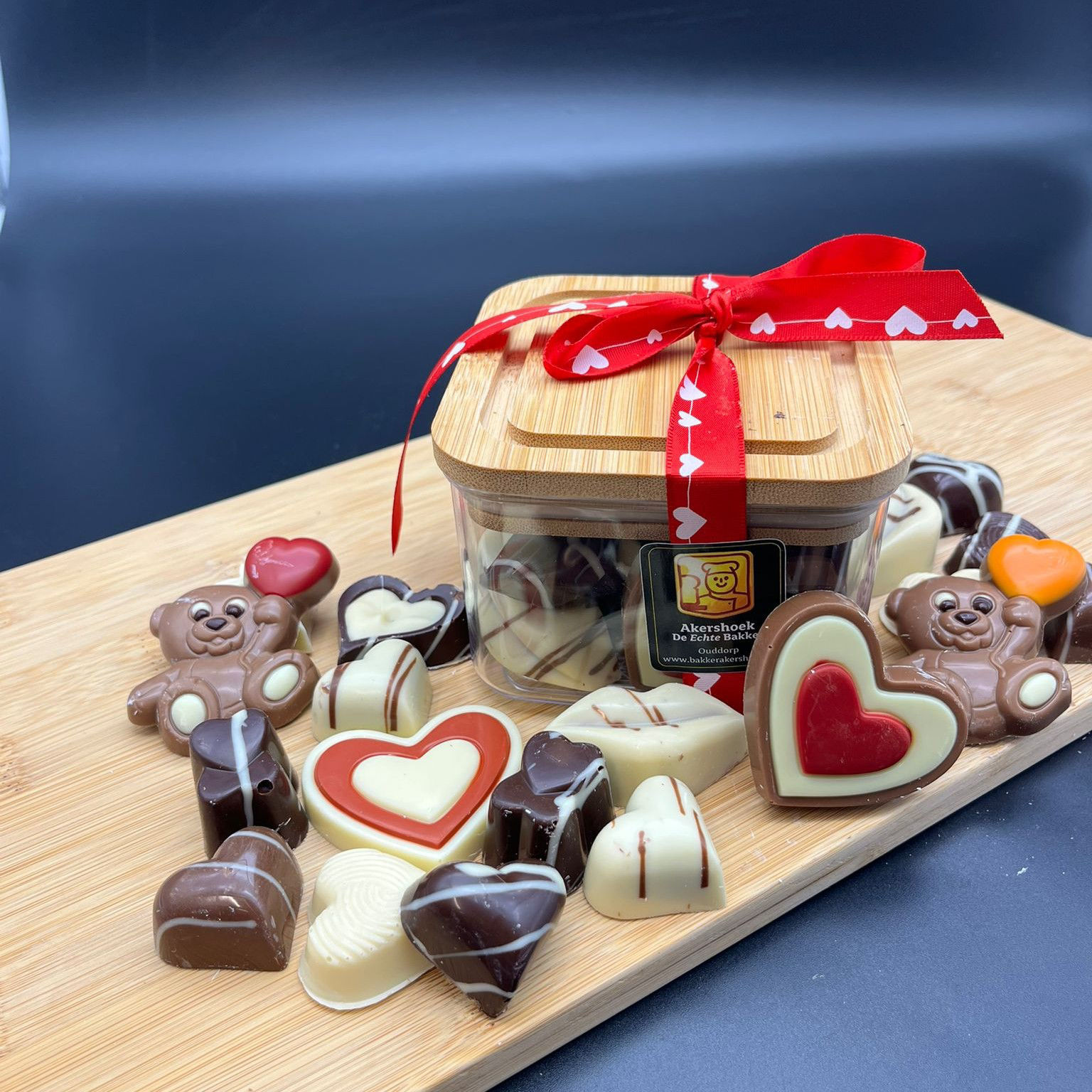 Gesorteerde Valentijns chocolade uit eigen bakkerij in een leuk bakje