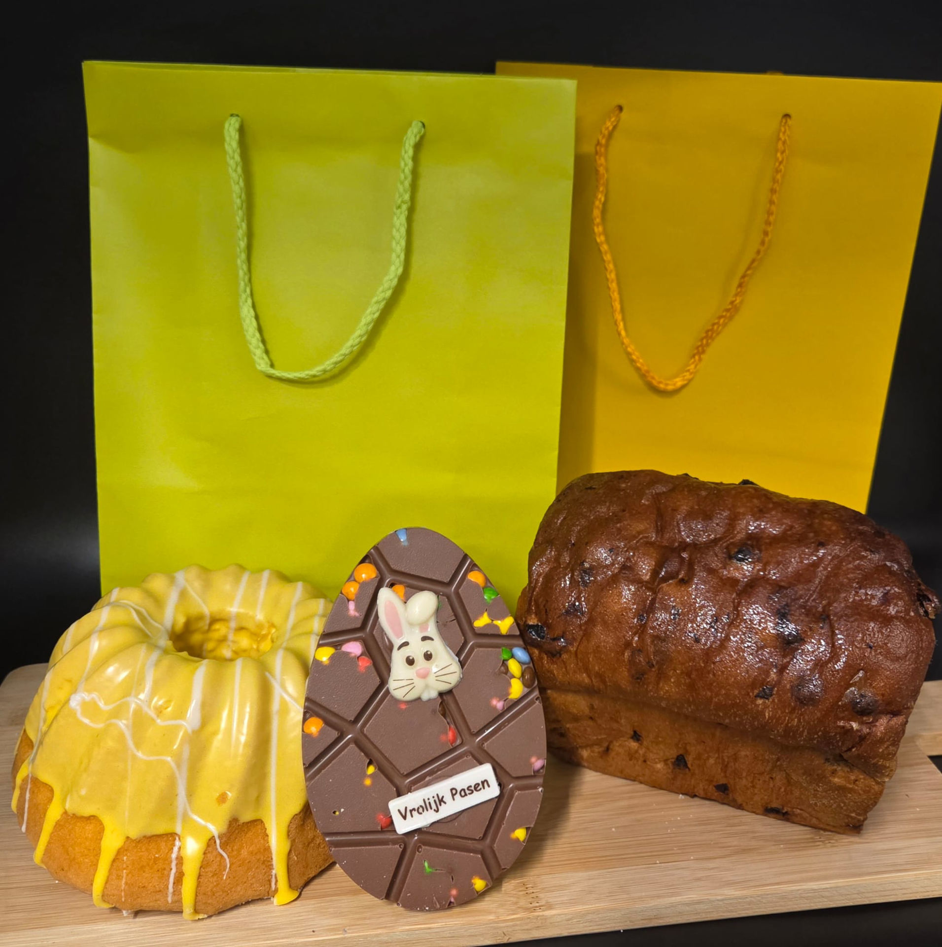 Een mooi geschenk pakketje met als inhoud: Cake tulband Chocolade Ei tablet Paasbroodje