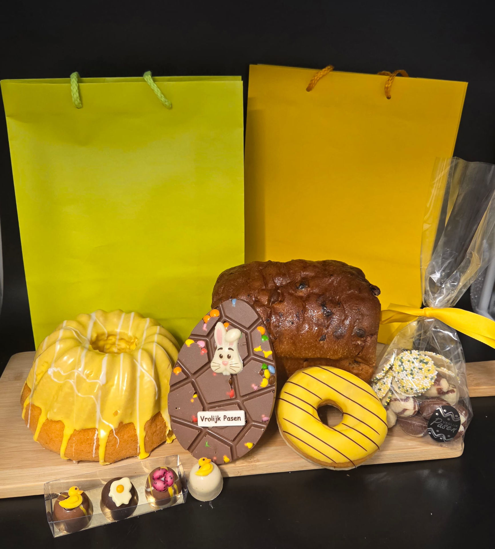 Een mooi geschenk pakket met als inhoud: Transparante koker met Paaseitjes Cake tulbandje Chocolade Ei tablet Paasbroodje Paas donut Paasbonbons Zakje Paaschocolade